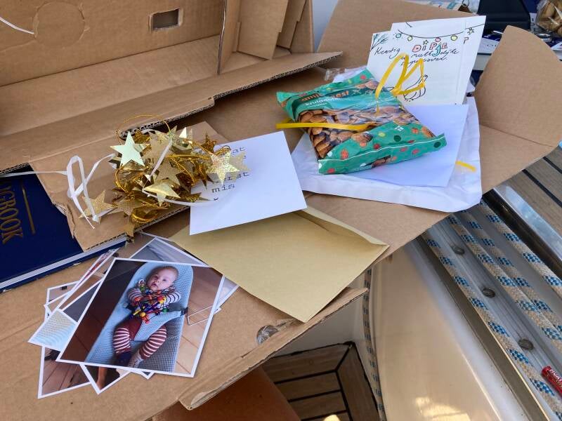 Het uitpakken van de tas is prettig emotioneel: wat een lieve berichten en gedichten van de kinderen. En natuurlijk verse foto’s van kleinzoon Boris! Dat was het wachten waard en nu zijn we echt klaar voor vertrek! We gaan de oceaan op; 1880 mijl naar Suriname!