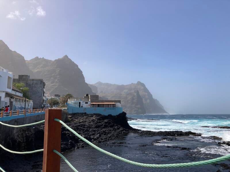 Sal is kaal en droog en daarom niet het meest mooie eiland van Kaapverdië, maar we doen een paar leuke uitstapjes. We gebruiken de ‘collectivo’ voor vervoer. Dat is een busje dat wacht of rondjes rijdt tot ie vol is en dan vertrekt. Een rit van 20 minuten kost 1.000 CVE’s (Cape Verdean Escudo) = 1 euro. We lopen naar een bodem van een krater waar zout gewonnen wordt. Net als alle andere toeristen gaan we er even zwemmen en al dobberend in het bremzoute water ontmoeten we een gezellig Nederlands koppel, Menno en Petra, die met een scooter over de eilanden rondtrekken. Ook bezoeken we Santa Maria, waar langs een prachtig wit strand tientallen luxe hotels gebouwd zijn. We huren een SUP, vergapen ons aan de overvloed van exotische vissen die aan land wordt gebracht en pakken een koel tapbiertje op één van de terrassen.