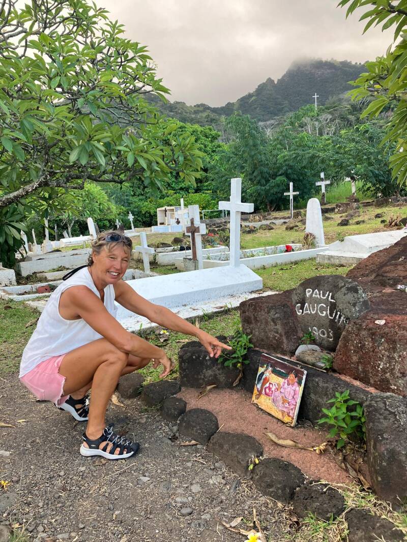 “Ik zie hem nog niet, maar hier ergens moet ie liggen.” Jacques Brel was makkelijk te vinden, die ligt dicht bij de ingang, maar het graf van Paul Gauguin is beter verstopt. Judith vindt het als eerste en natuurlijk maken we een fotootje. Beide beroemdheden kozen voor Frans Polynesië om hun laatste jaren door te brengen. Voor sommigen is dit een bedevaartsoord midden in de stille oceaan.